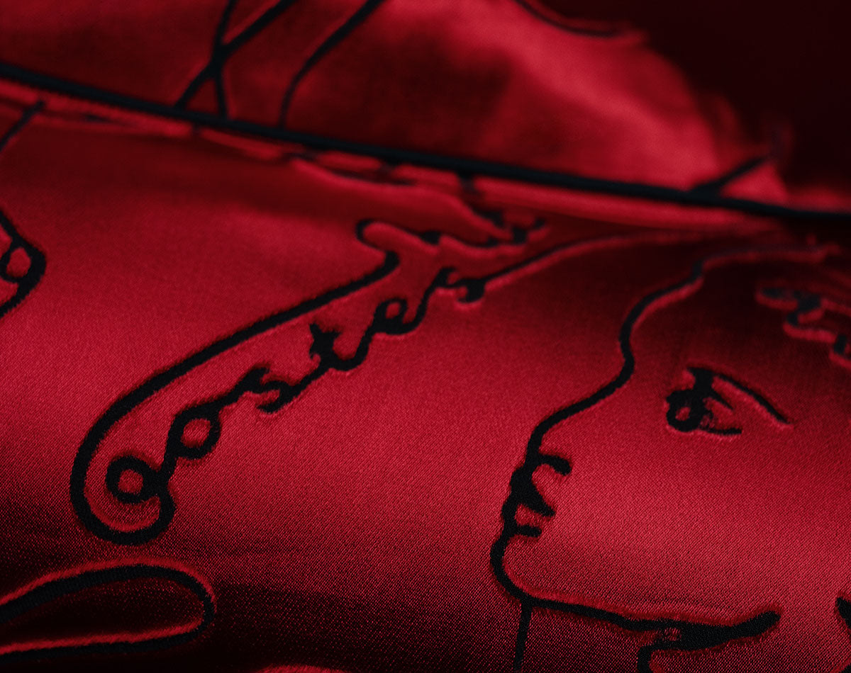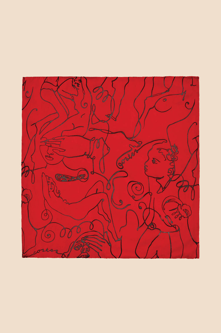 The Deneuve Liaisons scarf pays tribute to the glamour and intrigue of Hotel Costes. Cut from red silk devoré and adorned with the exclusive figure print, it can be worn at the neck, tied in the hair, or styled as a twilly—a playful nod to Parisian elegance.