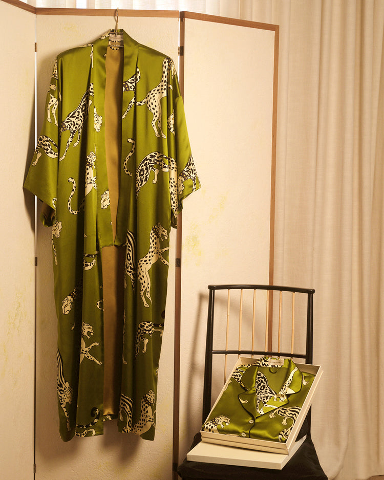 Yves Cosmos Green Leopard Pajamasin Silk Satin