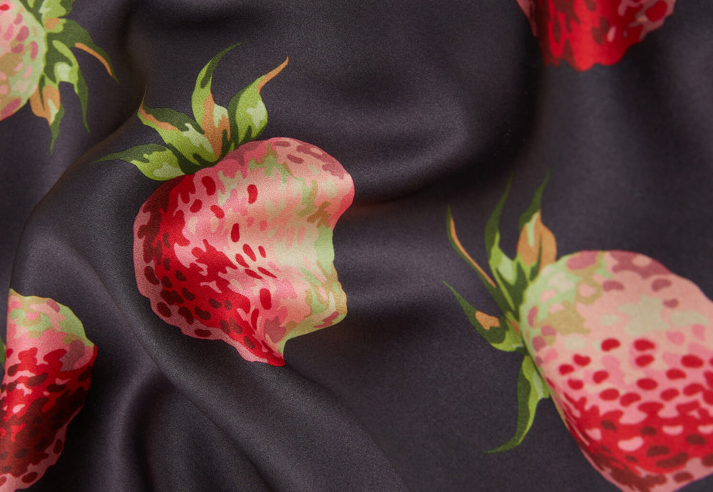 Our collections may be spun from seriously luxe fabrics, but we’ve always adored a dash of whimsy at Olivia von Halle. Case in point: the supersized strawberry screen-prints that are dotted throughout our SS25 collection. Inspired by lavish dinner parties and aristocratic country gardens, our Blythe and Bingham look just as ravishing against a manor-house backdrop as they do in more modern, metropolitan settings. Find them atop our robes, pyjamas and slip dresses this season in the most scrumptious 19-momme silk.