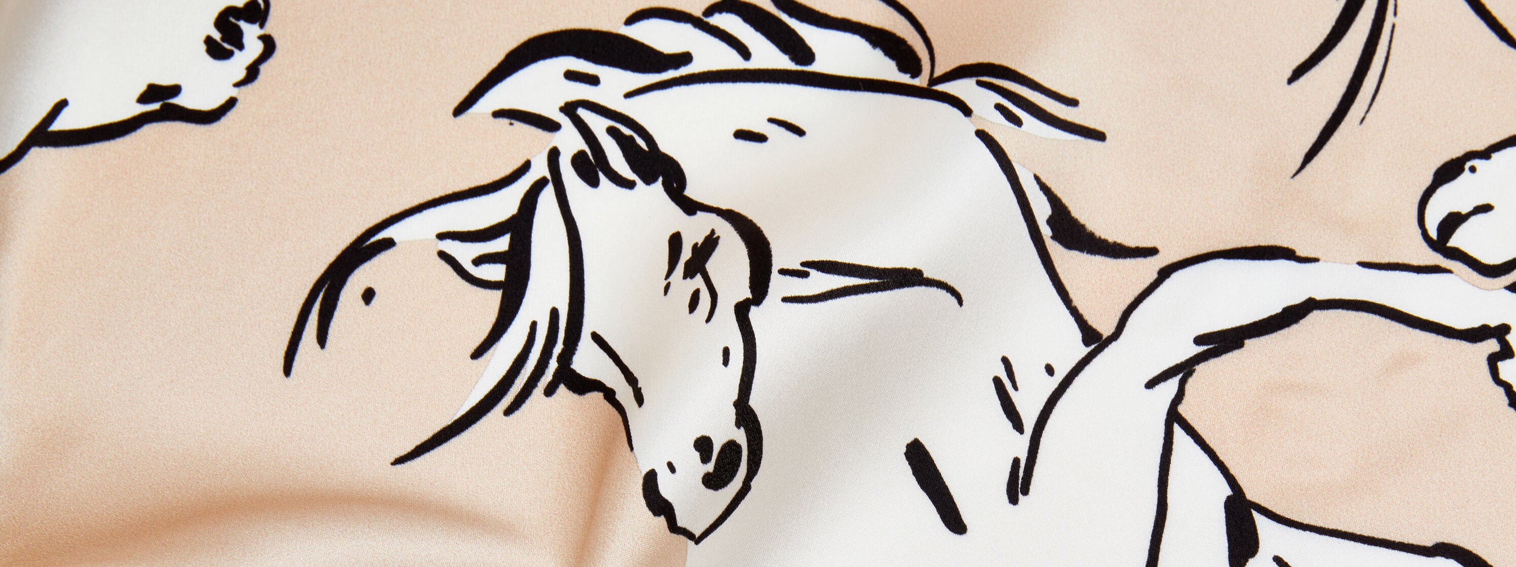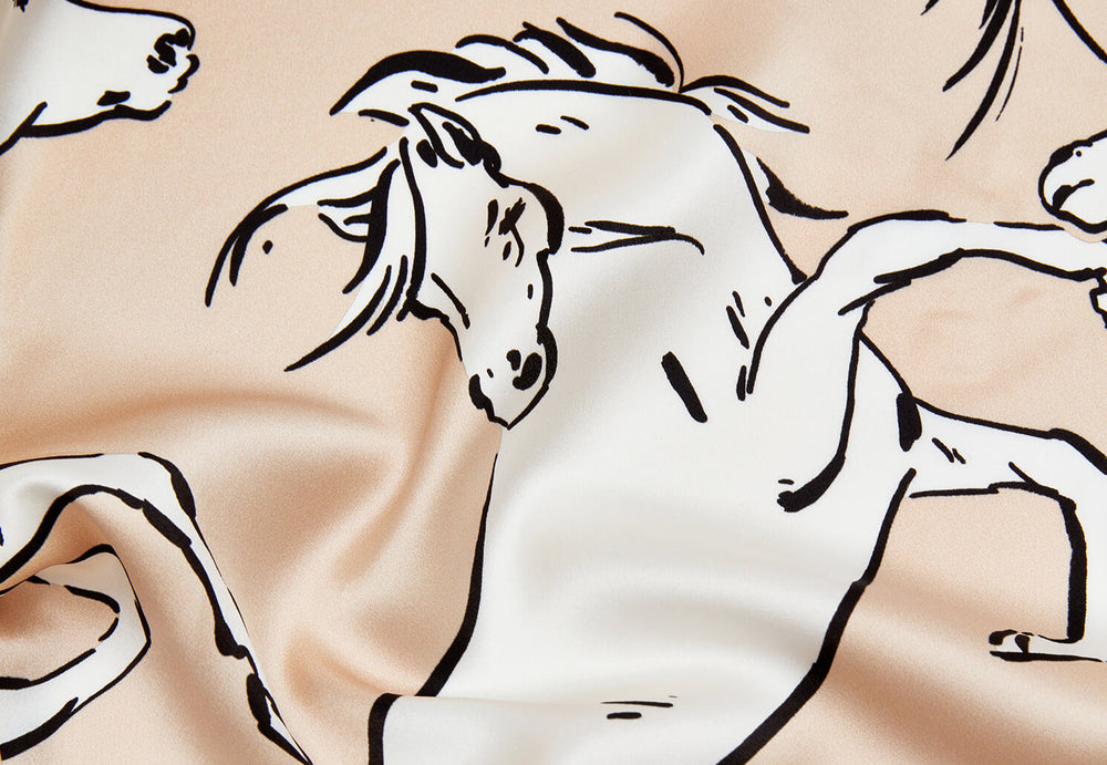 Our horse print is a playful addition to the Olivia von Halle stable for our SS25 collection and can be found galloping across caramel silk satin and blue crêpe de chine. Elevate lounging to an art form with a little help from the Casablanca Cordelia, or channel your inner chatelaine in our exuberant Mimi Clementine robe.