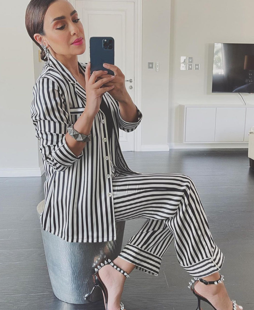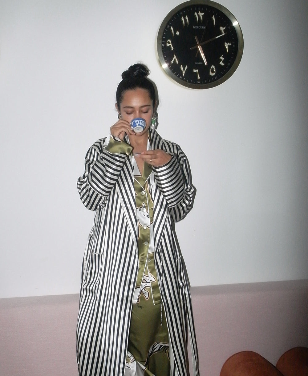 Creative Director Anna Vitiello serves at-home glamour in the Capability Nika, our show-stopping full-length silk robe in monochromatic lines.