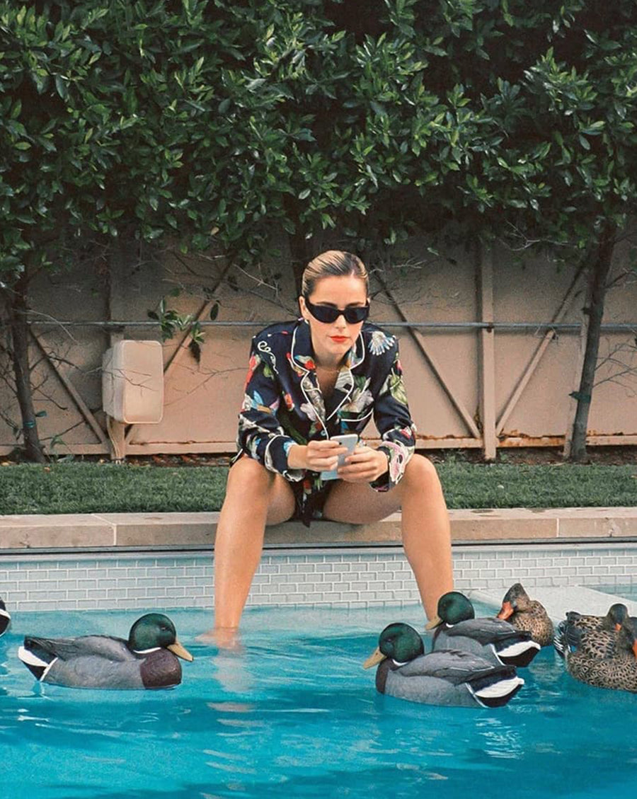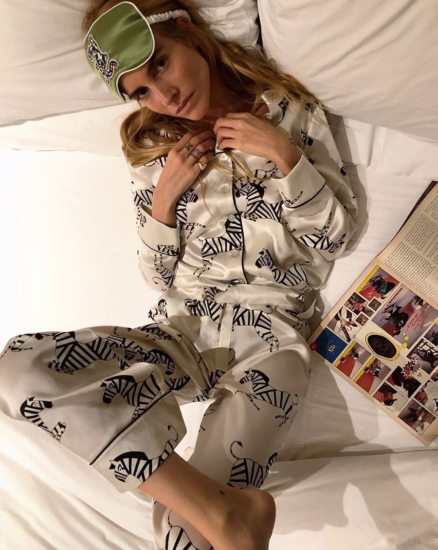 When it comes to definitive OvH attire, there are few better examples than the understated charm and easy refinement of Blanca Miro, here sporting the Lila Zebedee Silk Pyjamas and Eye Mask Fai. Subtle but striking, the best-selling Zebedee is back. Our London studio design showcases OvH’s signature prancing zebra, screen-printed onto luxury ivory silk. Set a new limit of luxury leisurewear, with mother of pearl buttons, and jet black piping.