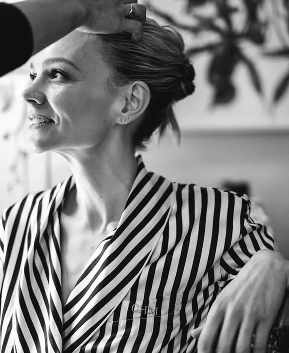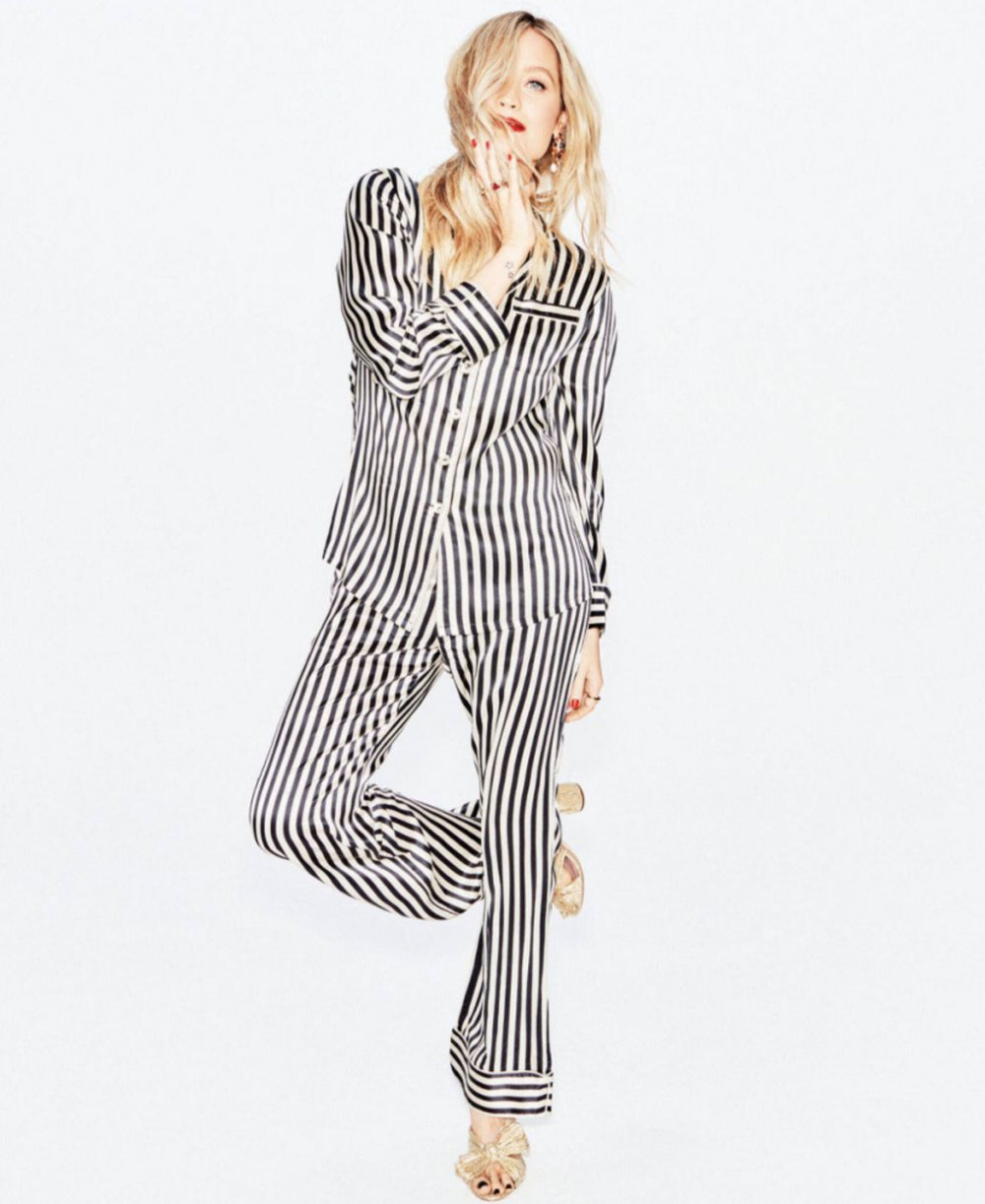 Selena Gomez sits smart in the Coco Oyster, embodying the at-home elegance of our silk set. A lesson in silk tailoring, the Coco Silk Pyjamas draw from Coco Chanel’s habit of wearing her lover’s pyjamas to bed. Jet black piping is a neat contrast to the Olivia von Halle oyster silk, in an adrogynous style that errs to feminine. Able to be monogrammed as a lifelong gift for special someones.