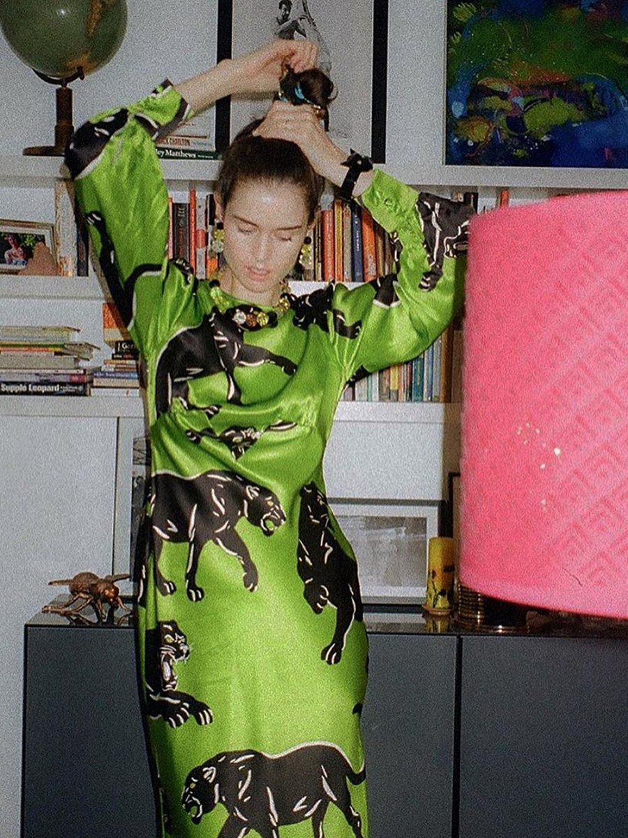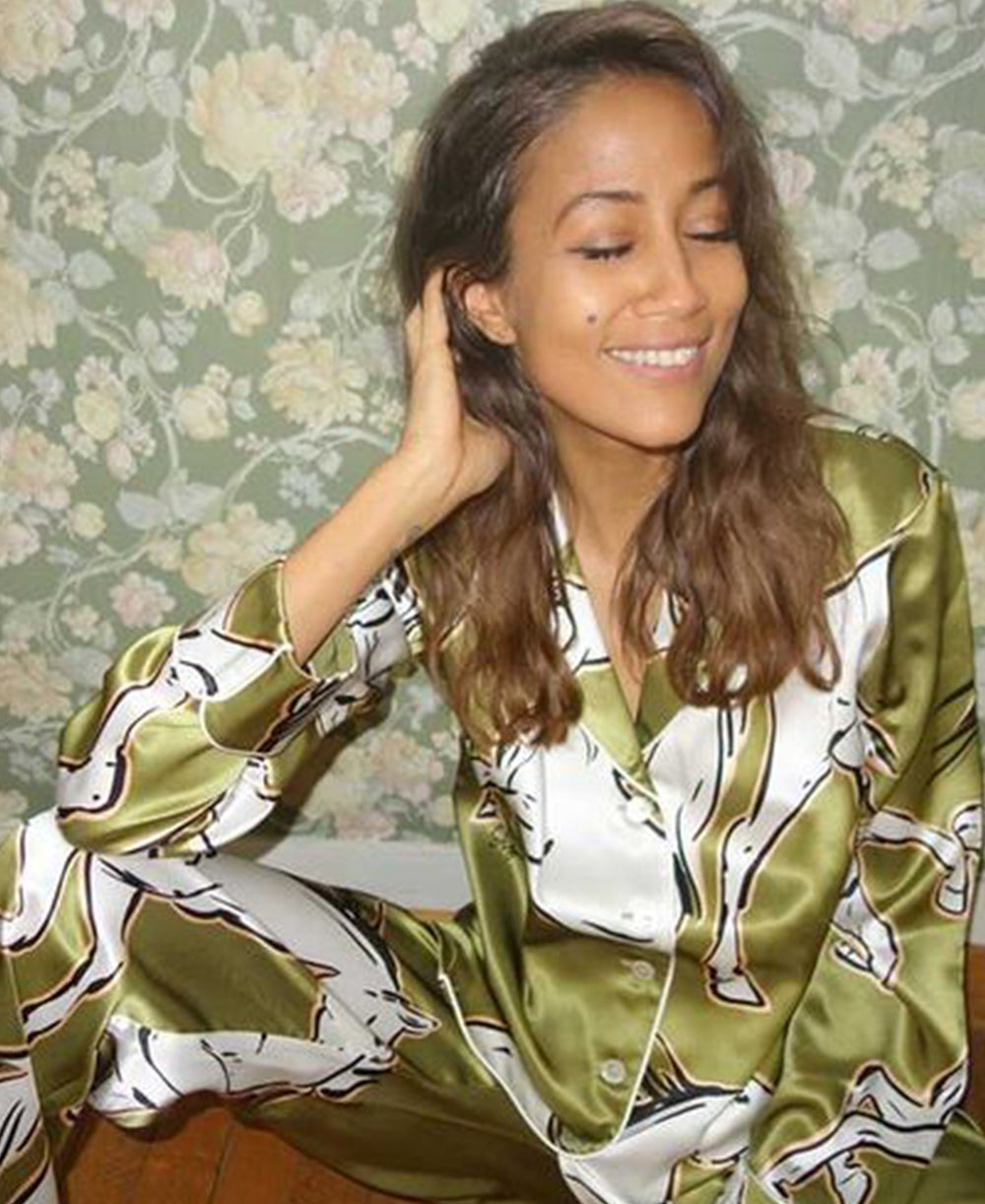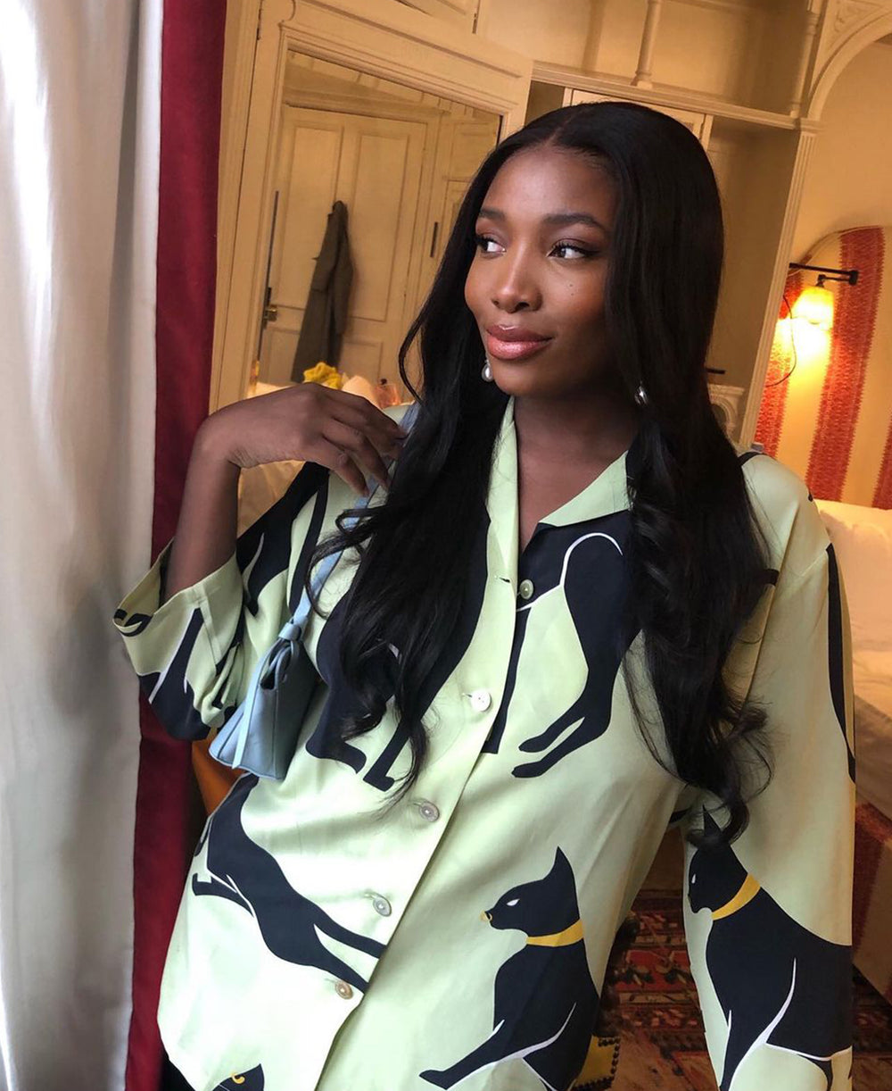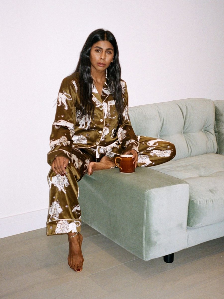 On the prowl or at ease, Monikh shows the defiant print and luxe appeal of a Lila Narcissa. Luxury lime green panther printed silk pyjama set. Screen printed with a print designed in our London studio, exclusively for Spring / Summer 2020. With jet black piped silk trims and mother of pearl buttons, the Lila Narcissa is crafted in Olivia von Halle’s 100% 19 momme silk.