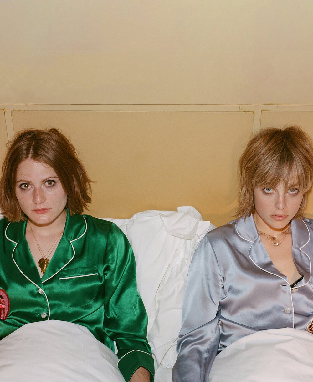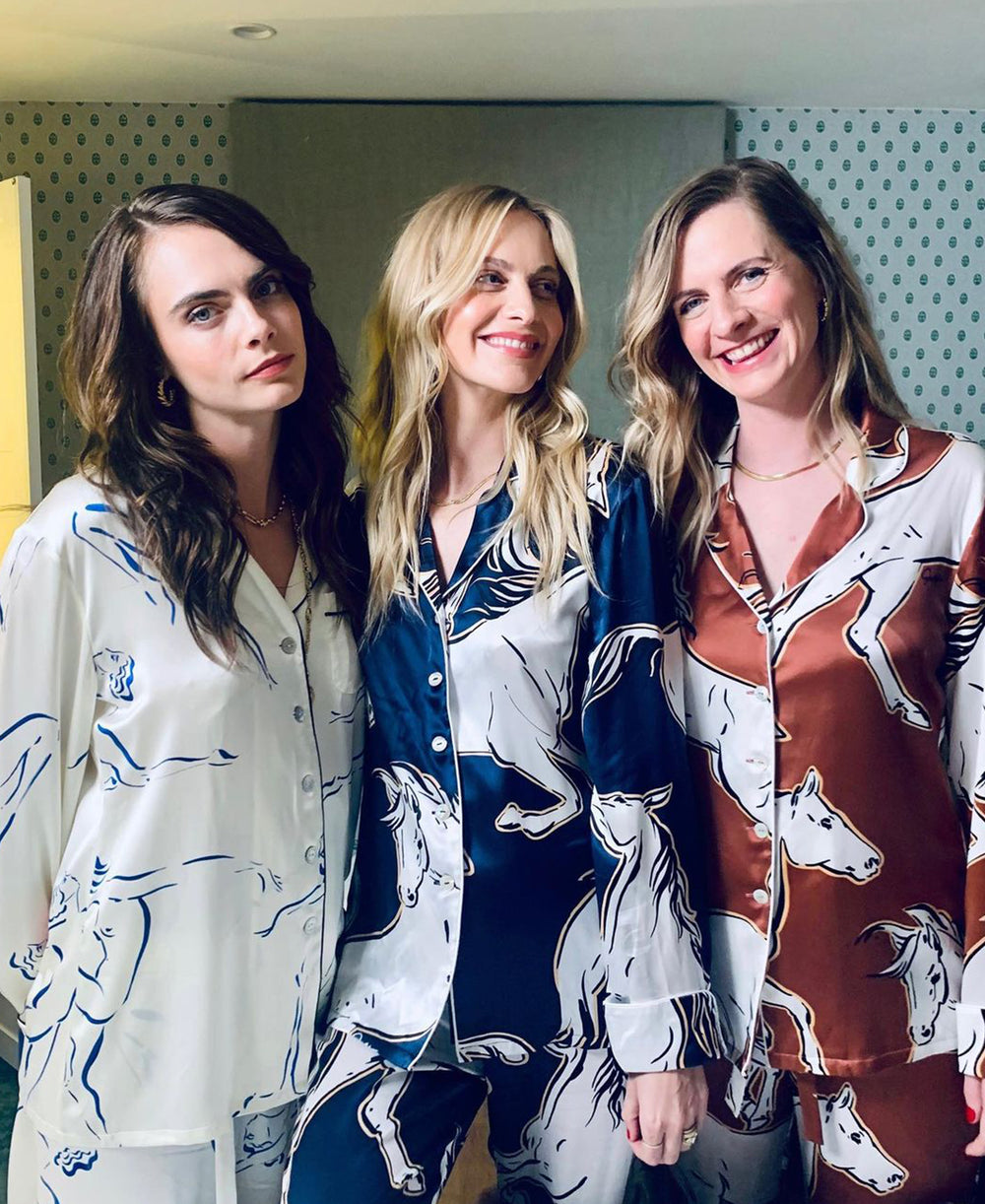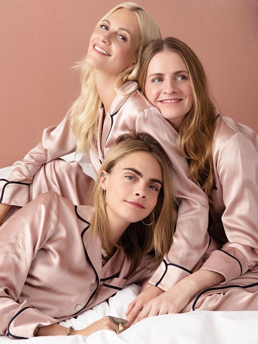 The Delevingne Sisters hold an all-OvH pyjama party. The complementary colours of their Lila silk pyjama sets, from our Visions of the Future Collection, shows how decadent down-dressing can be a family affair.