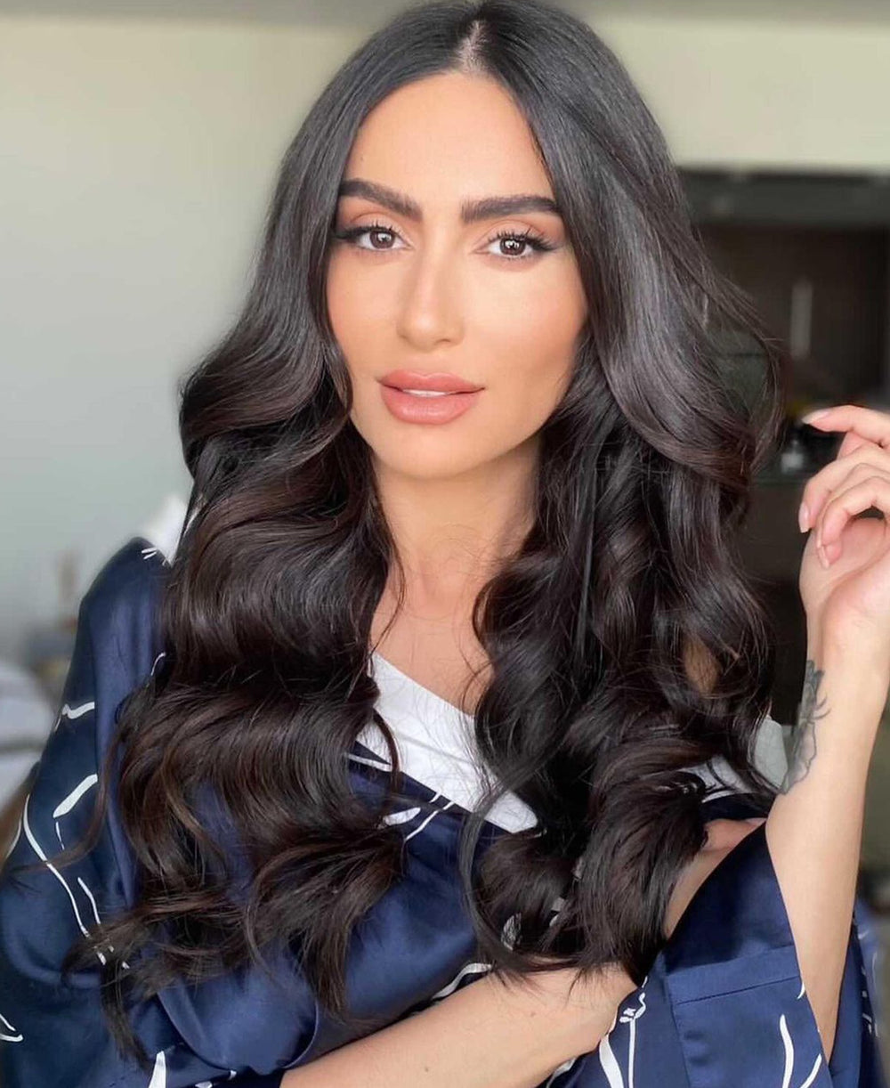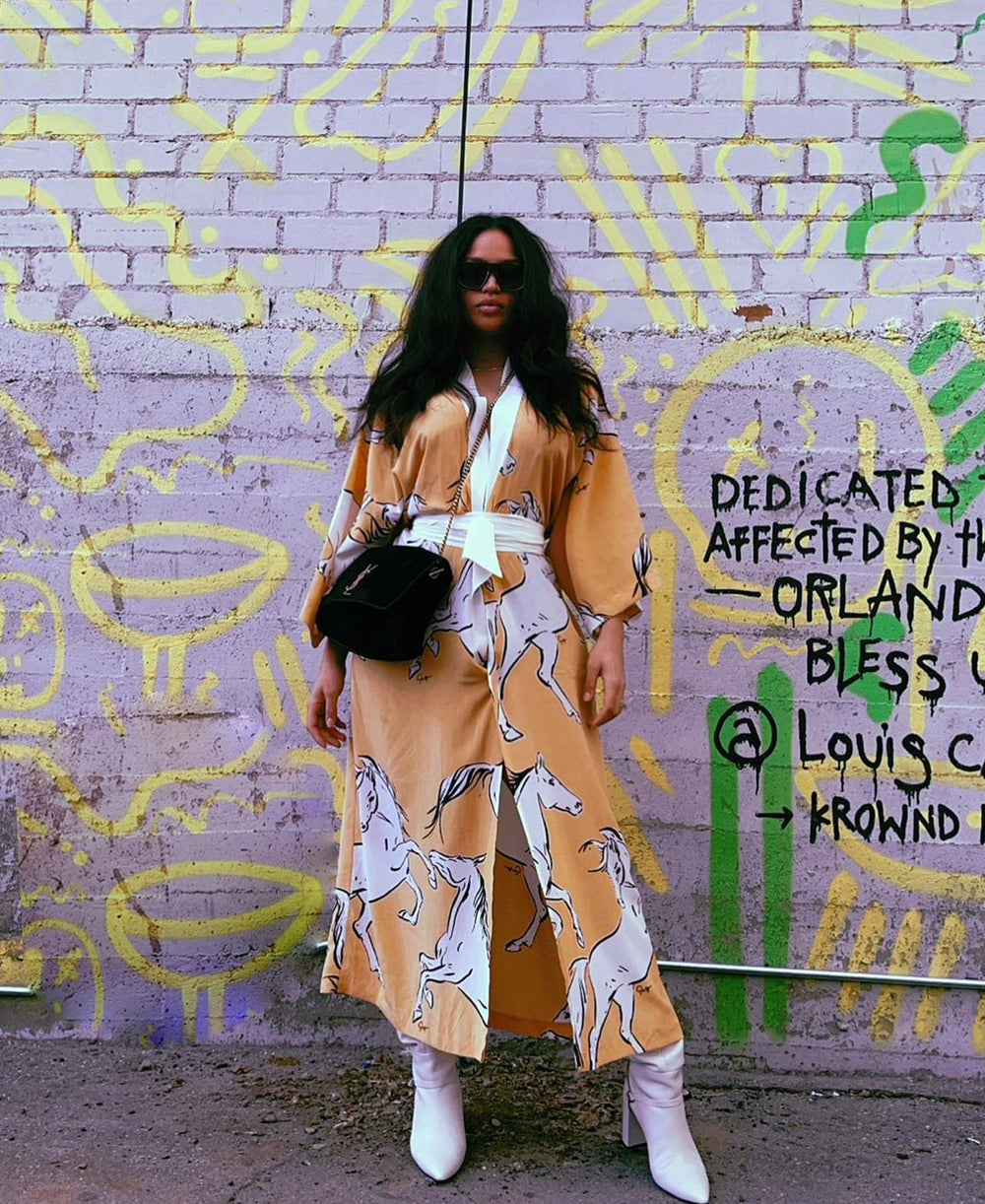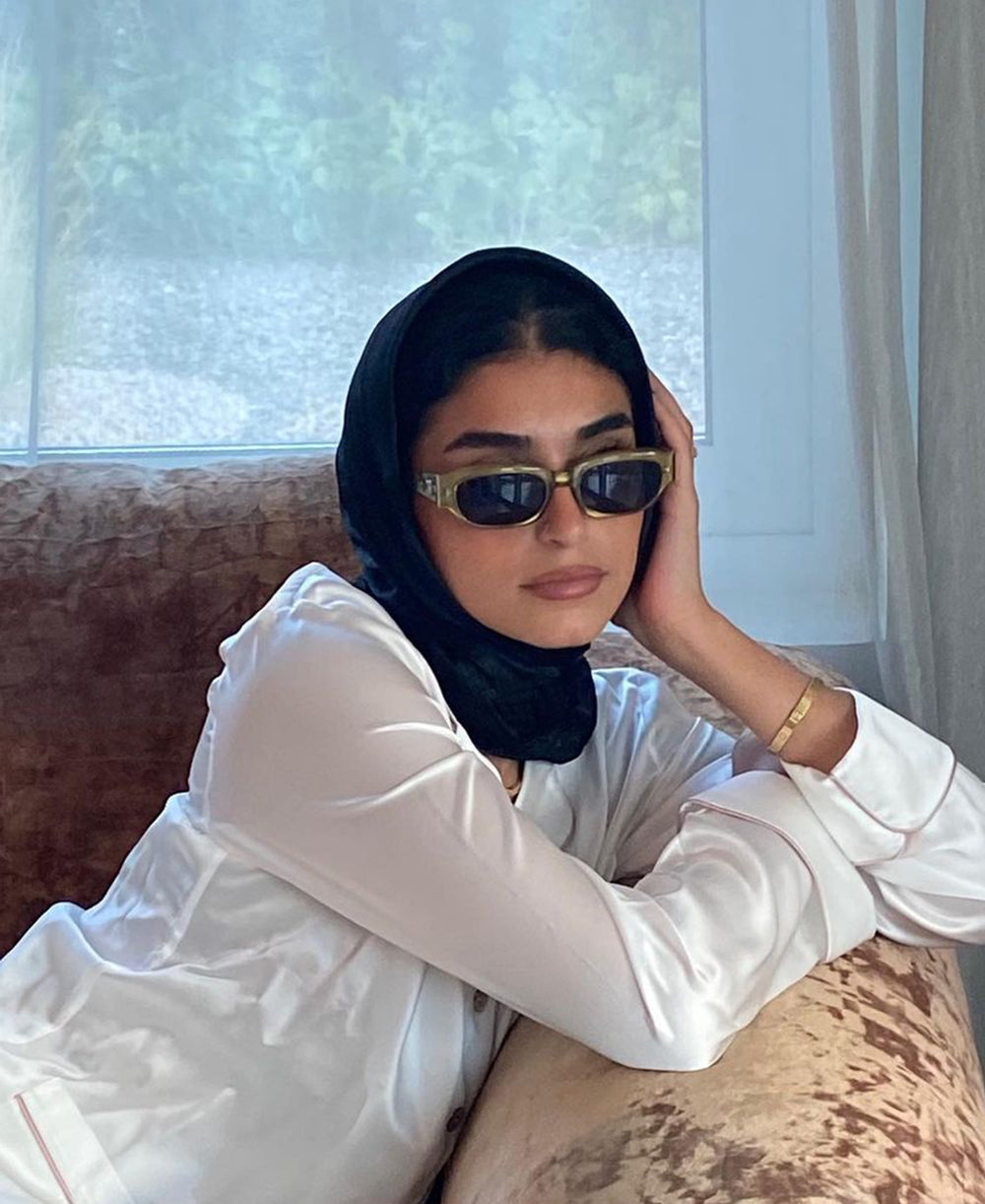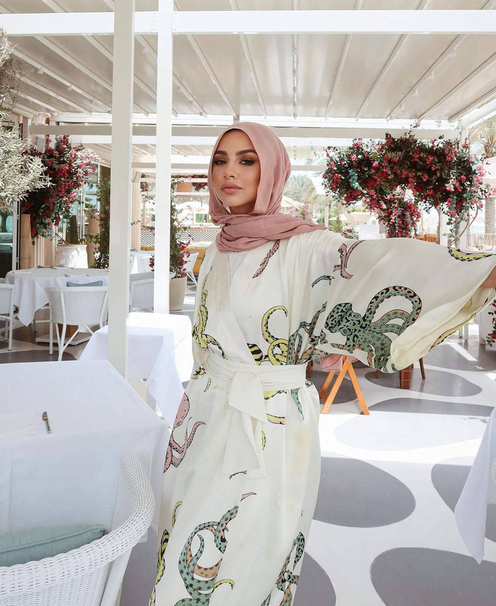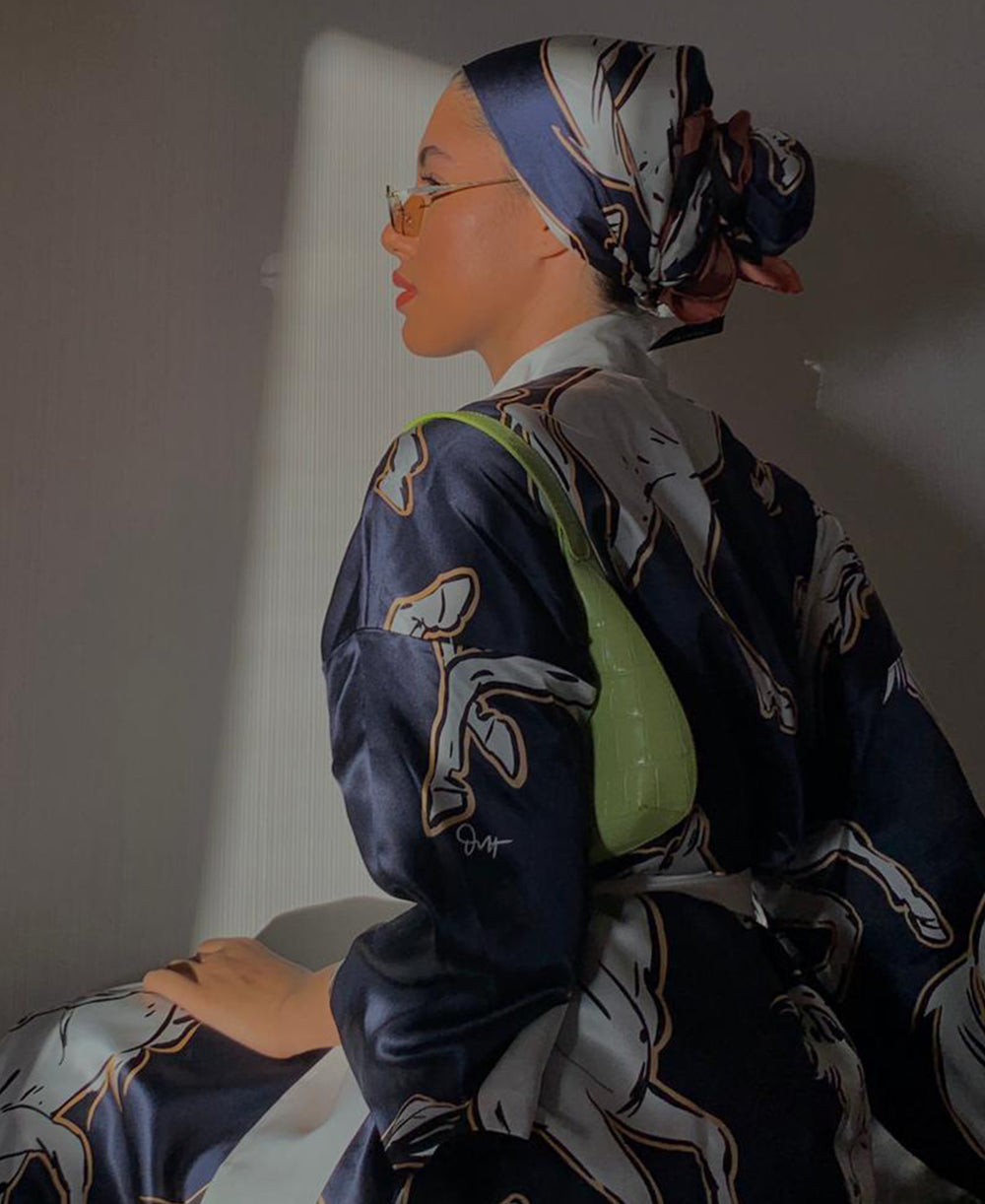 Fashion influencer and entrepreneur Soha Mohamed Taha looks effortlessly elevated in our Queenie Marina silk robe and its pastel palette. Ever graceful and on-point, the influencer showcases the robe's endless versatility, perfect for daywear as well as nightwear.