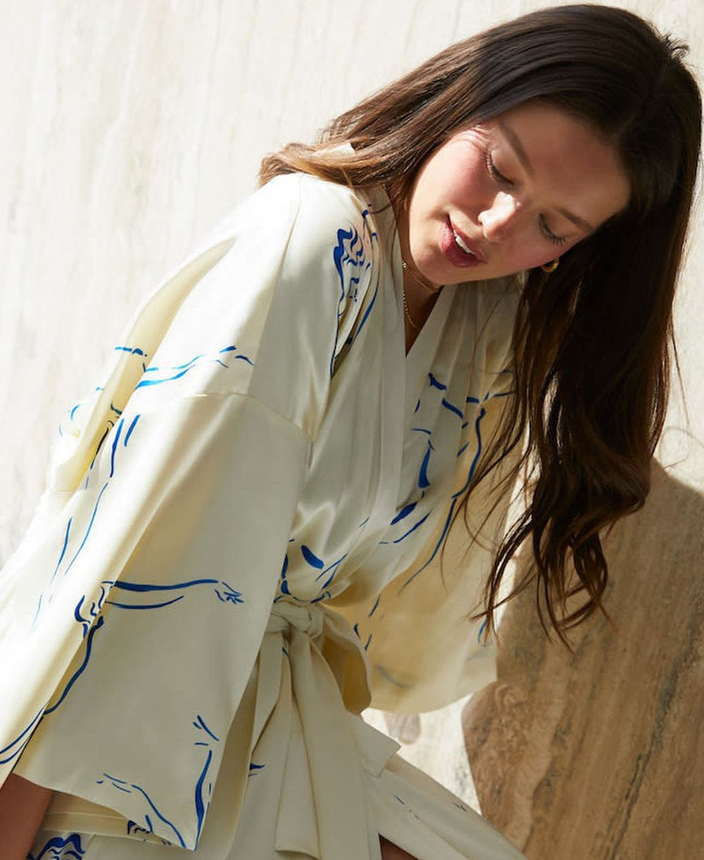 Transcendent Indya, in the galactic delight of our Mimi Serendipity Silk Kimono-style robe; bringing constellation to your drawing room. Try it with your Bella Olympian Blue (don't just trust us—it's written in the stars).