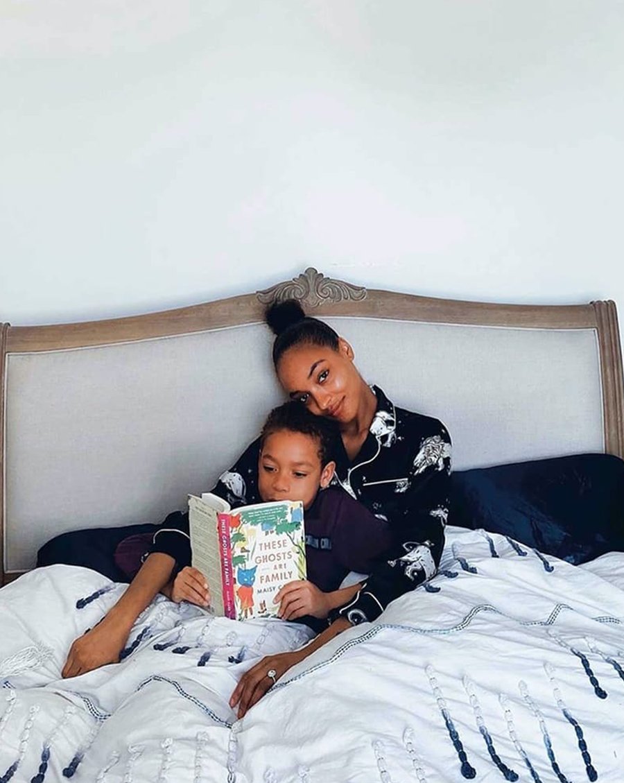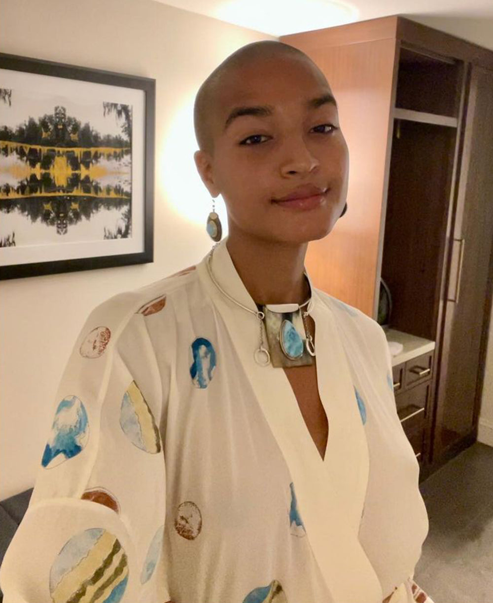 Queen Nefertiti was otherwise known as the Queen of Grace—few superstars today embody the kind of everyday grace and easy virtue of Jourdan Dunn. Here at home for Vogue with her young son, Dunn shows that at-home elegance can still stun. Screen printed with a print designed in our London studio, and crafted from the finest silk, the Lila Nefertiti is a luxury lounging set without comparison.