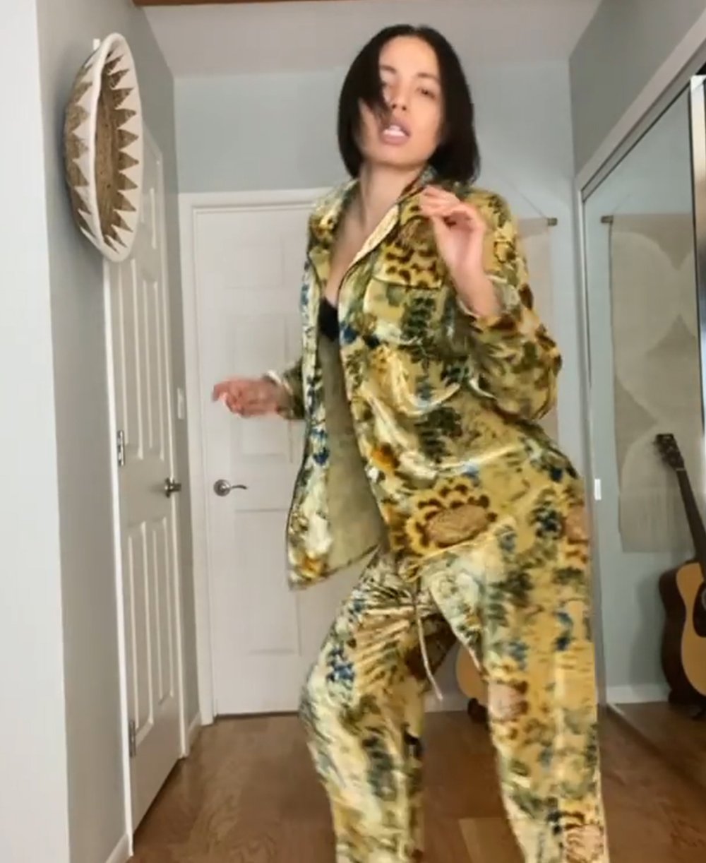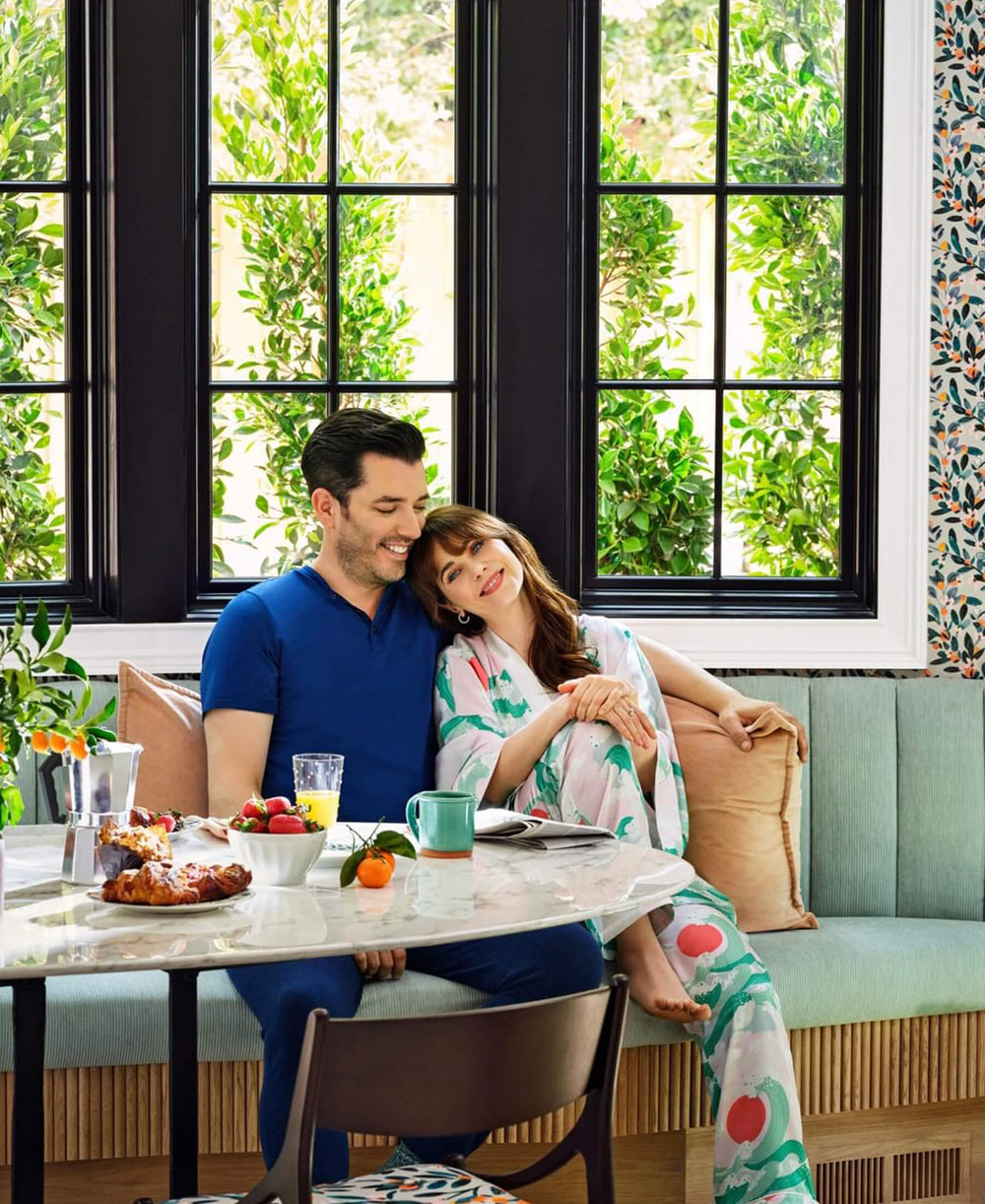 Zooey Deschanel is the epitome of at-home decadence in our Lila Ola pajama set. The actress looks effortlessly elevated in OvHsilk printed pyjamas whilst opening her doors to Reveal Magazine for a tour of her renovated Los Angeles home.