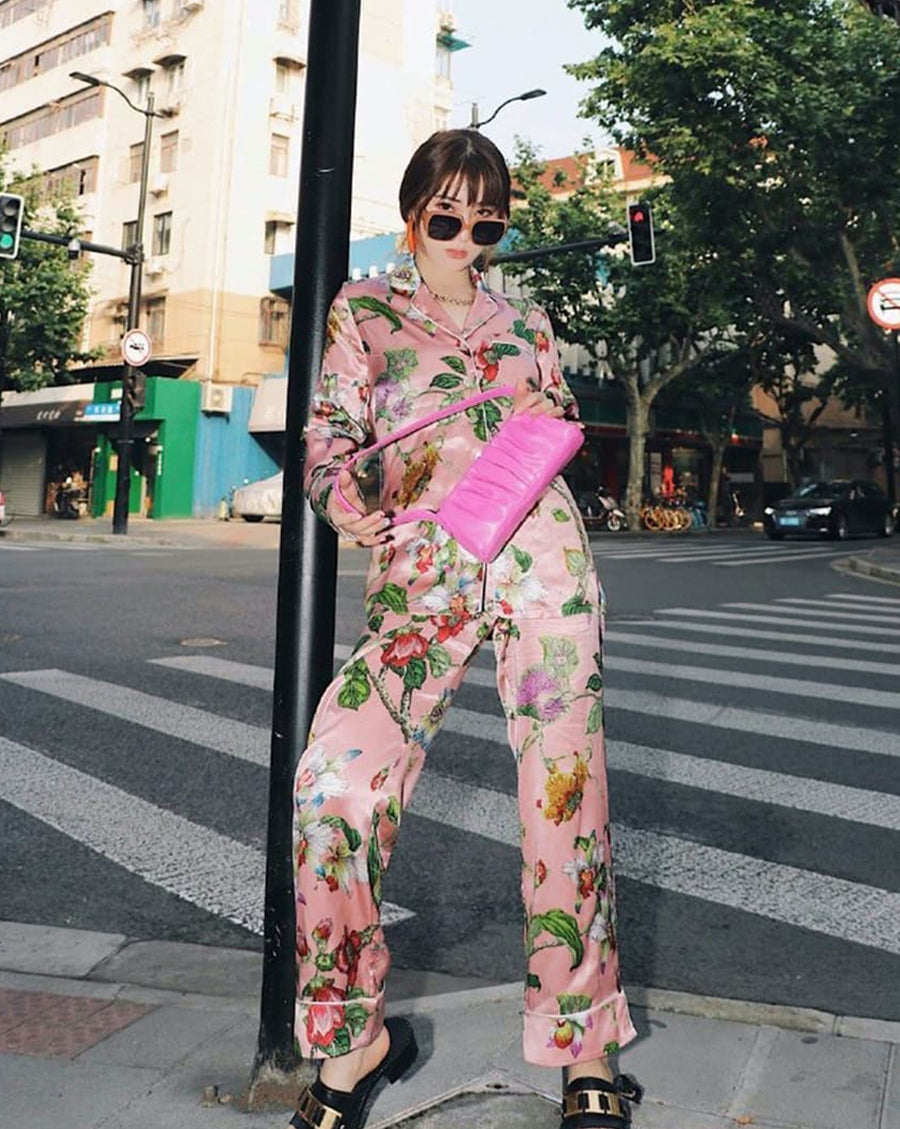 It’s the little things that keep us satisfied. Canary yellow wallpaper, matching settee, and a riotously floral print—all provide the perfect spot for a bit of OvH lounging. Jess Maybury photographed in OvH for Brown’s Fashion. Luxe lounging doesn’t get better than this. The clothes may make the man, but we think the woman makes them all her own. Uncompromising in quality, this full-length robe is fully lined in 19 momme silk. Crafted in the best-selling Nika print with patch pockets to the front and long-line cuff sleeves.
