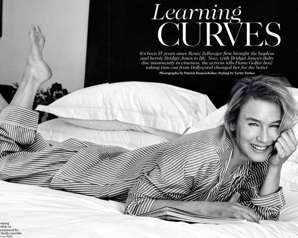 That’s a film star grin, and these are A-list pyjamas. Two-time Oscar winner and lifetime star Renée Zellweger exudes her natural warmth and stunning style in the Lila Twill. Shot by Patrick Demarchelier for her British Vogue cover story, July 2016.