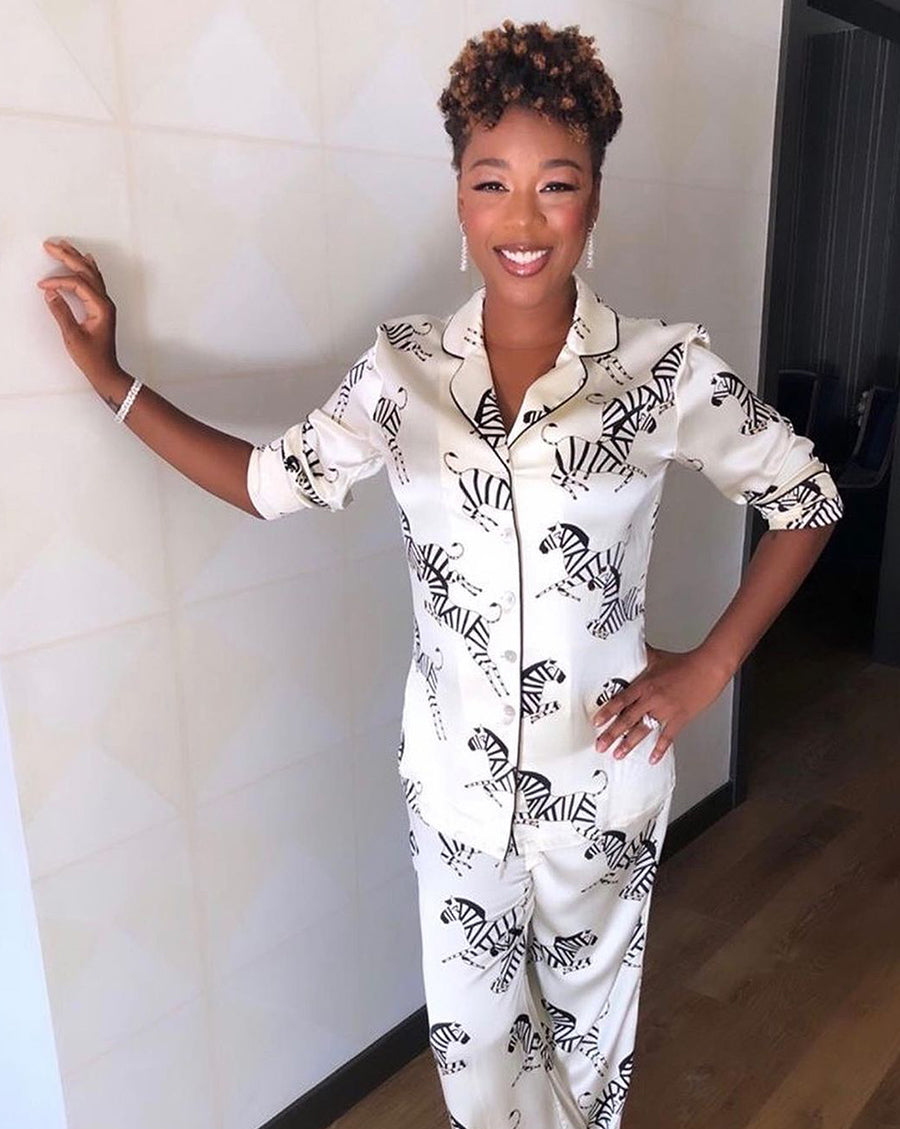 After seven outfit changes, Oscars 2022’s host Regina Hall closed out the unforgettable 94th Academy Awards wearing our chic Oscar-worthy Coco Evergreen silk pyjama set. A memorable fashion move for an anything-but-snooze-worthy night.
