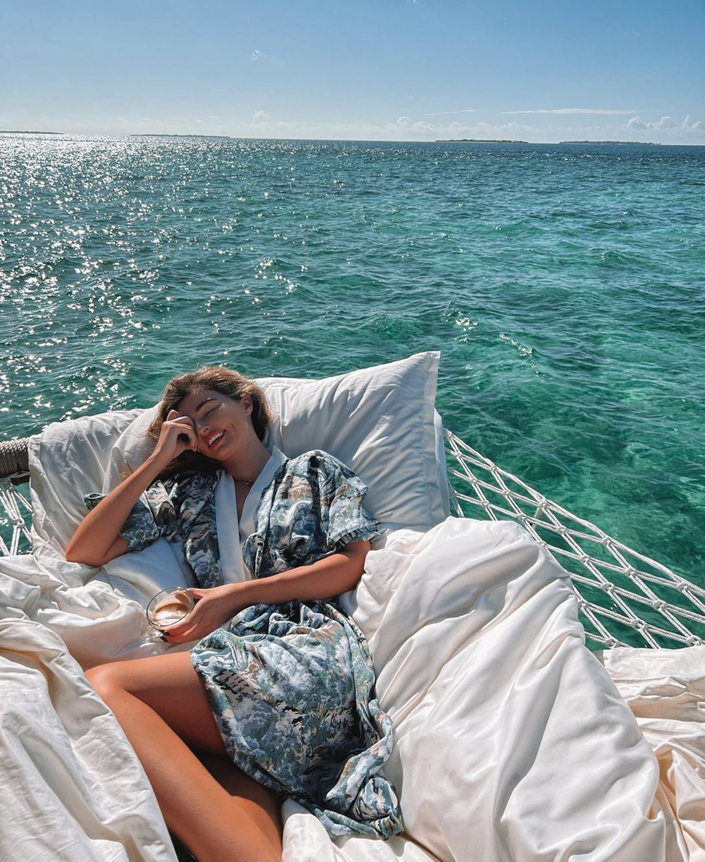 Drink in Cyrielle Verstuyft's glamorous ode to high-sea downtime, wearing her Olivia von Halle silk robe. Cyrielle's vision is the late-summer dream–suspended in a hammock somewhere with the dappled sunlight playing on your face; the Queenie Veneto, our full-length silk kimono style robe, makes for the ultimate vision of decadence. Enjoy the unique luxe loungewear and silk styling of Cyrielle here.