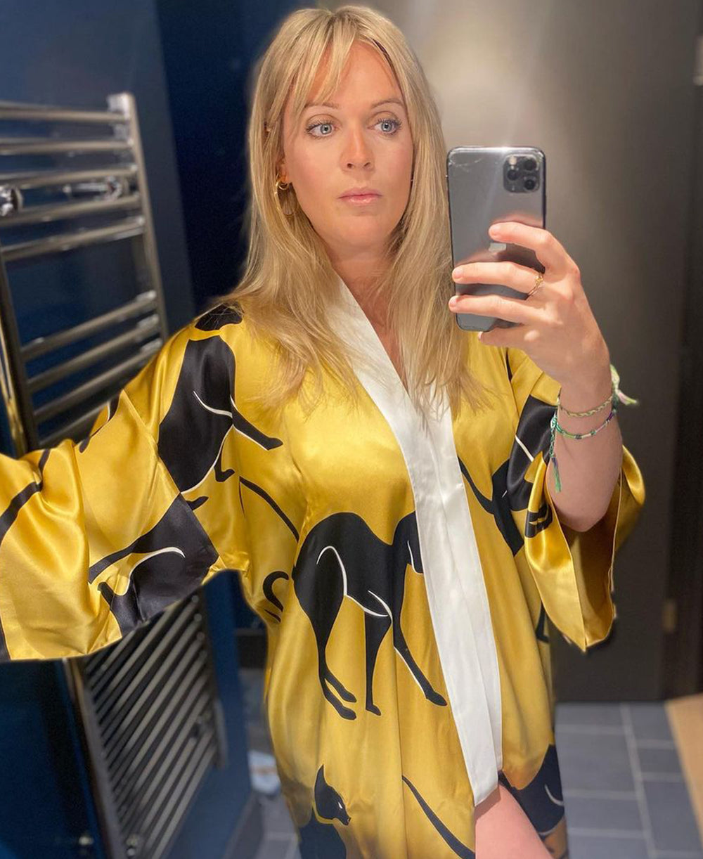 Dream girl Dolly Alderton showcases the power of the Queenie Sphinx silk kimono-style robe, in delivering utter glamour at any hour.