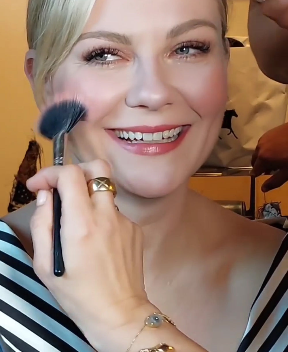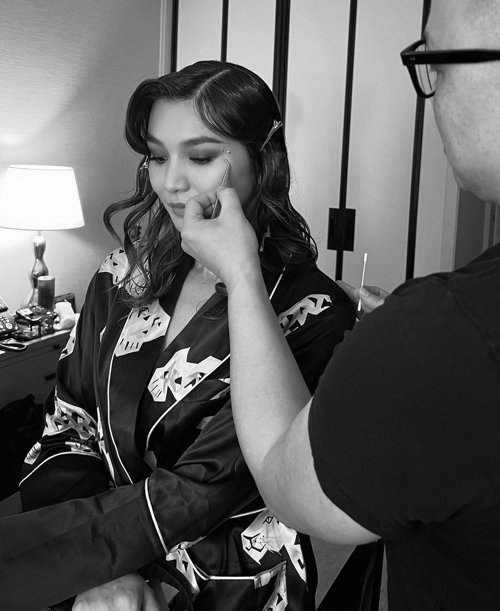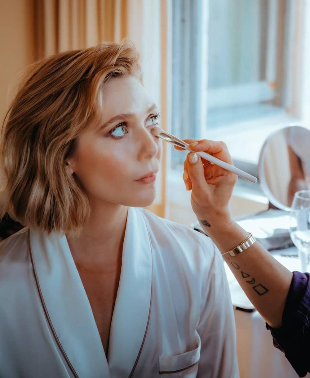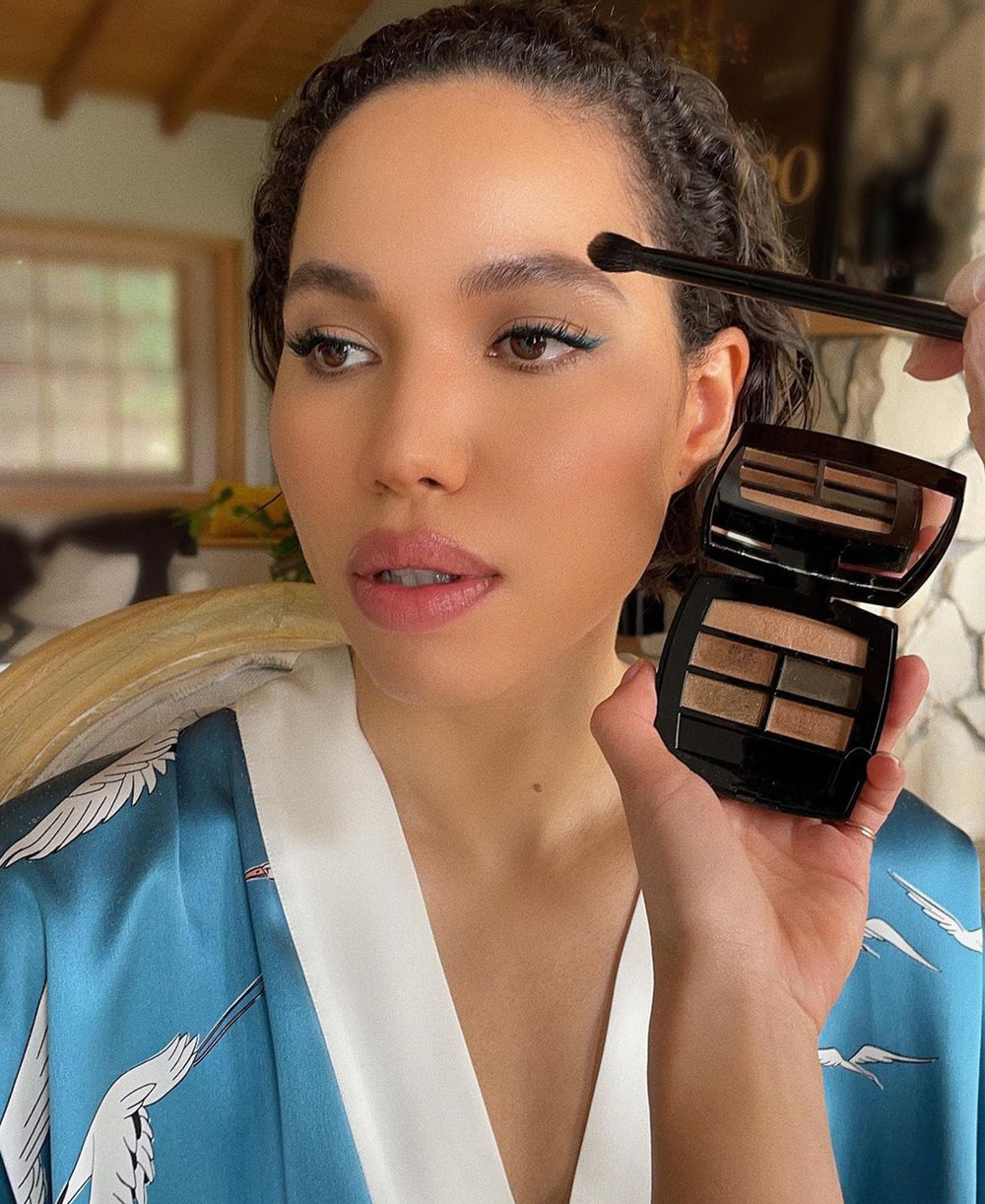 With her trademark chic, Phoebe Dynevor shows off her Queenie Cadence silk satin robe for her Charlotte Tilbury moment–showcasing the perfect transitional style our Queenie silk satin full-length robe allows.