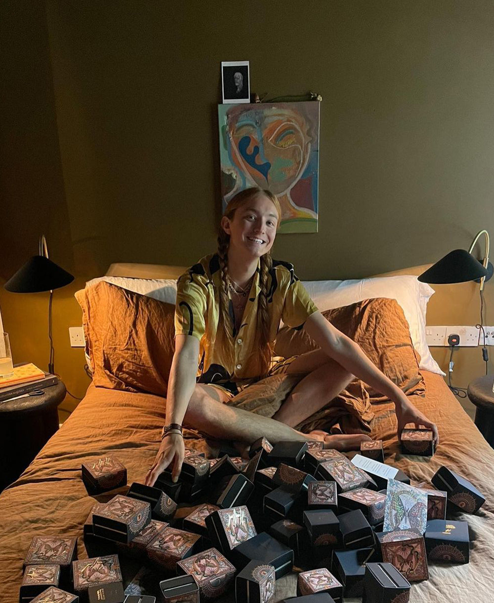 Following the footsteps of their first ever runway show, bright young thing Harris Reed steals another scene in the Emeli Sphinx. In their characterful, playful style, we love Harris' look in Emeli Sphinx silk satin pyjama set, in nightshirt and shorts, as the final word in indoor dressing.