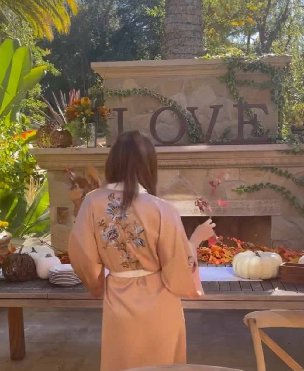 Our robes bring all the boys to the yard—the Queenie Appleyard. VB sports the Queenie Appleyard; you’ll be seeing stars once you see how good she looks. Crafted in cream 19 momme silk and cut from ten metres of continuous silk, this robe exudes luxury.