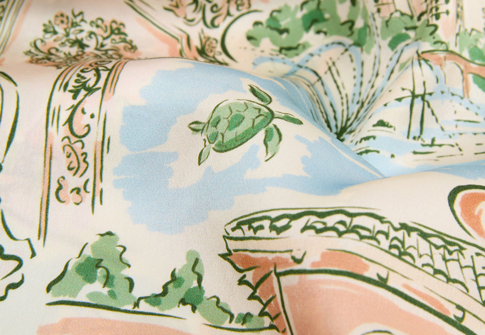 Hand-drawn at Olivia von Halle’s London studio, The Mansion print captures both the storied soul of the estate and the lively rhythm of Dallas itself. Its playful vignettes celebrate the property’s most beloved details: the iconic cupola, ornate plaster ceilings of The Mansion Library, blooming magnolias in the manicured gardens, and the impeccably chic décor of the celebrated Mansion Bar. Woven throughout are motifs that nod to the heart and heritage of Dallas, rendered in a colour palette inspired by The Mansion’s distinctive peach-hued stucco façade that has welcomed guests for generations.
